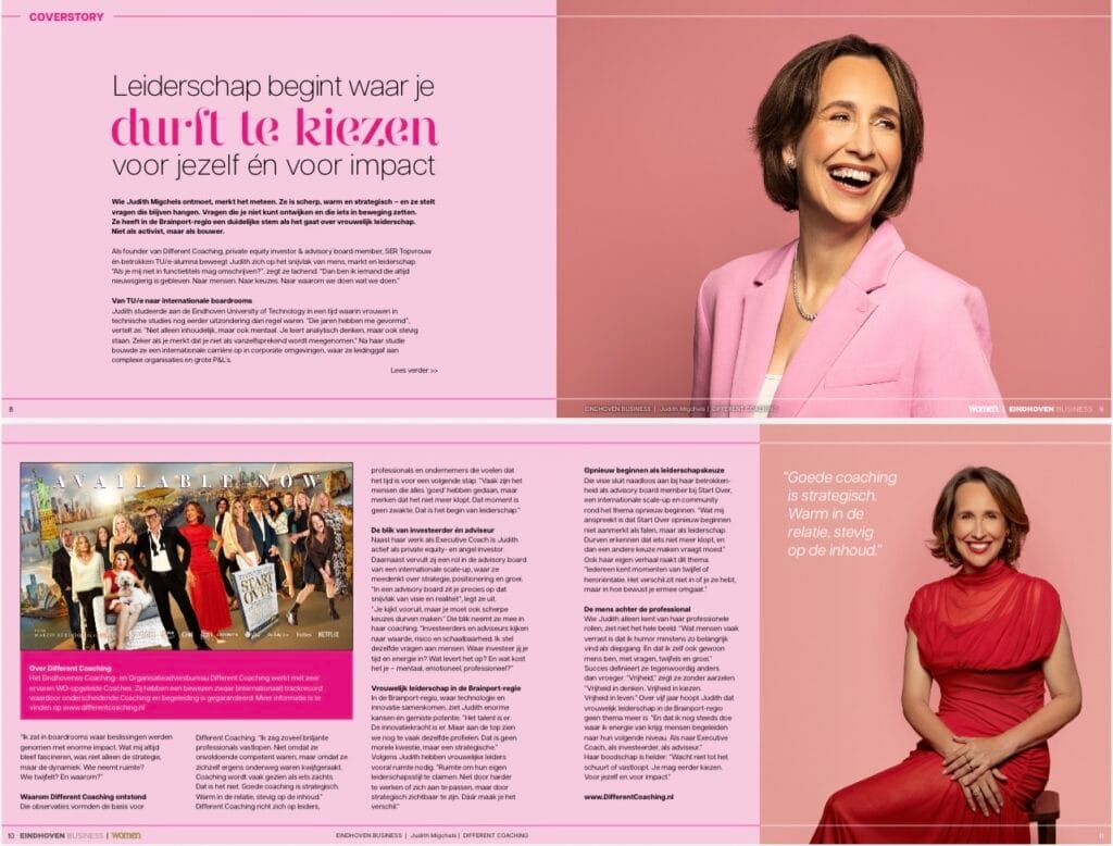 Vrijheid in leven.” Over vijf jaar hoopt Judith dat vrouwelijk leiderschap in de Brainport-regio geen thema meer is. “En dat ik nog steeds doe waar ik energie van krijg: mensen begeleiden naar hun volgende niveau. Als naar Executive Coach, als investeerder, als adviseur.”